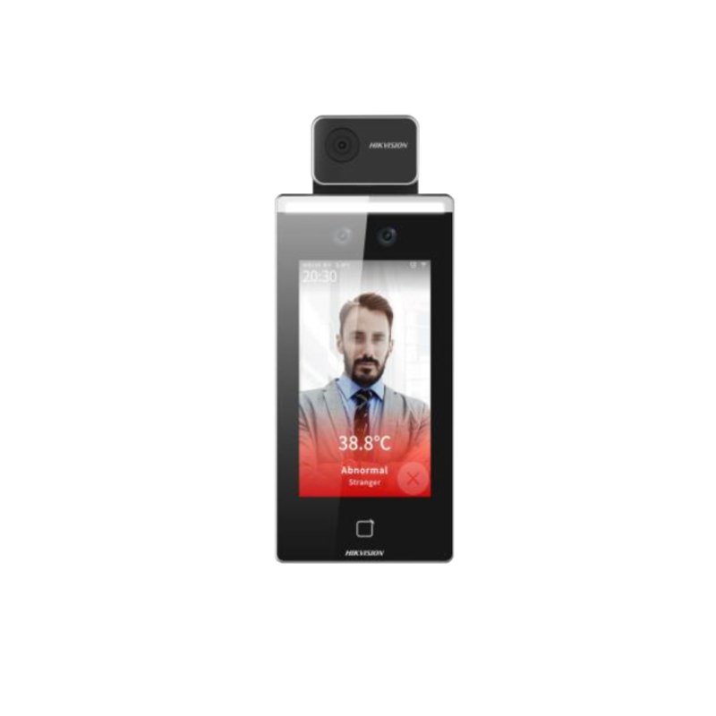 Terminal de reconhecimento facial TRHIK706K é um acessório de controle de acesso integrado com função de detecção de temperatura corporal. O terminal mede e registra a temperatura na central de informações.